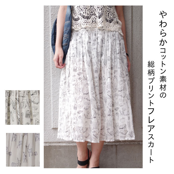 スカート ミディ丈 ひざ丈 フレア コットン インド綿 ガーゼ やわらか ふんわり ナチュラル 総柄 シカ 文具 オフホワイト アウトレット セール 在庫処分コットンフレアスカート アウトレットセール メール便OK
